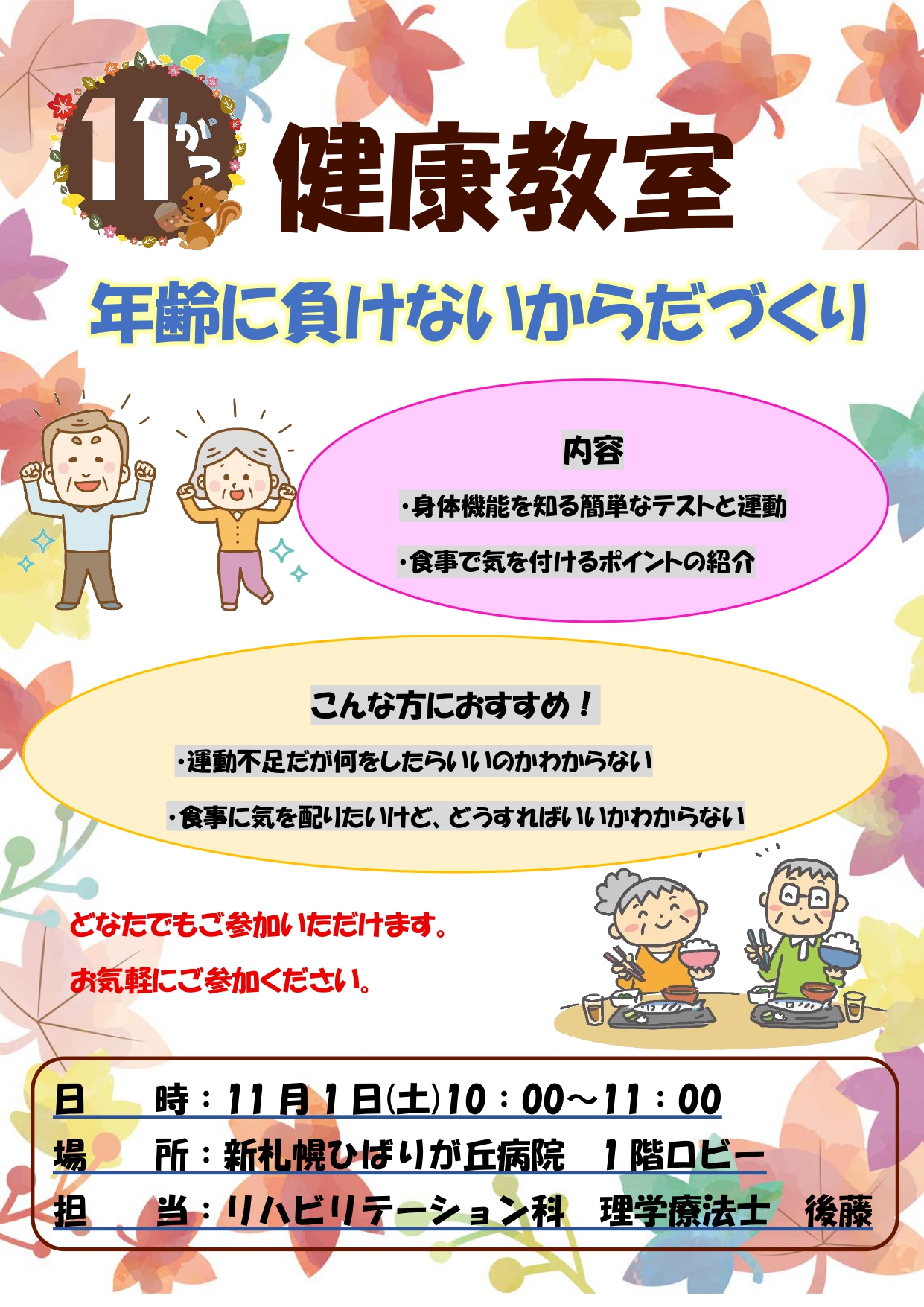 25.10.16 お知らせ 健康教室開催のお知らせ(11月) 11月1日(土)10:00~11:00に1階ロビーにて健康教室を開催します。 今月のテーマは「年齢に負けないからだづくり」です。 運動不足だけど何をしたらいいかわからない、食事に気を配りたいけど何をしたらいいか・・・ 身体機能を知るテストや食事のポイントなど紹介します。 是非参加お待ちしています!