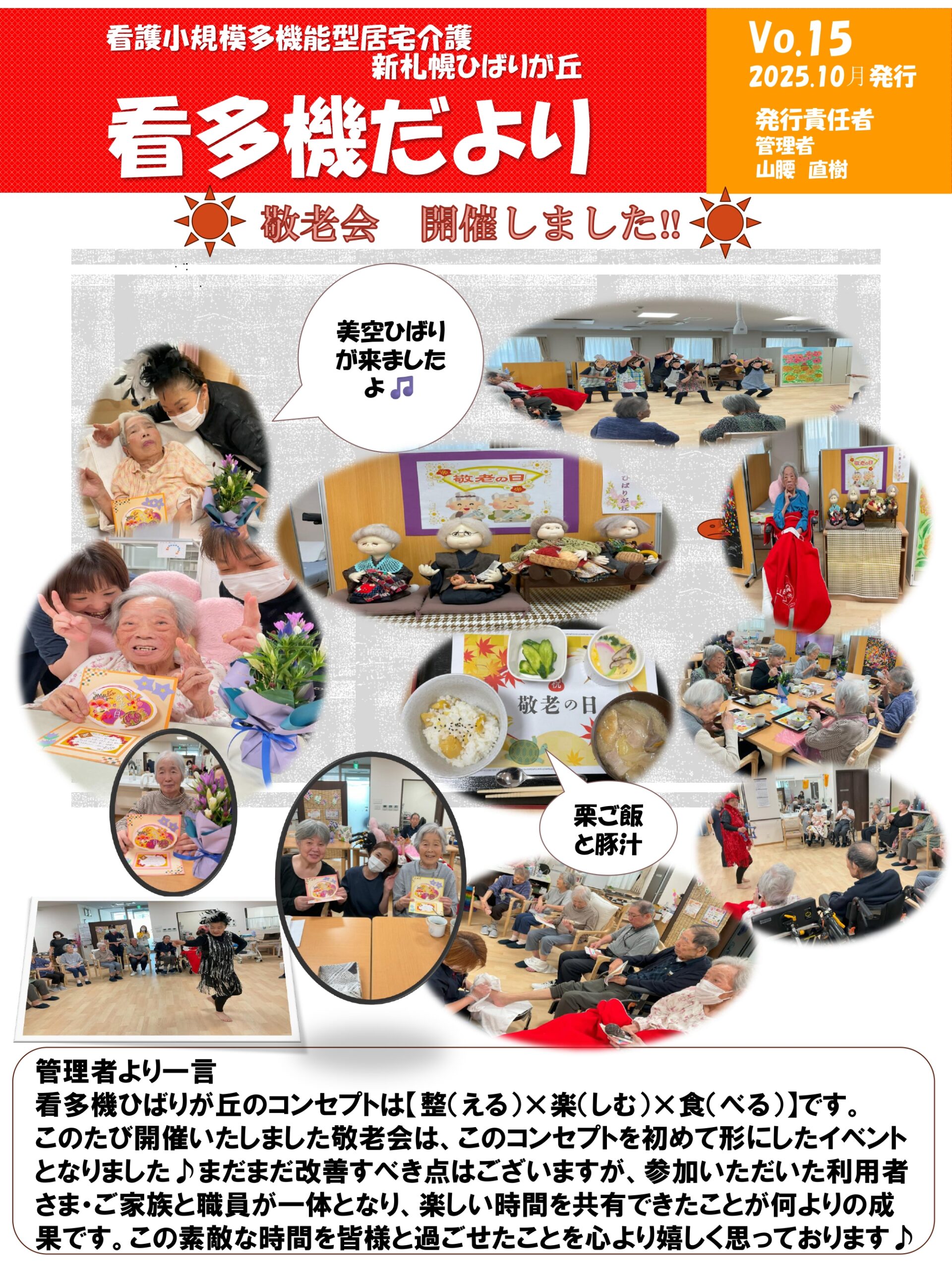 25.11.01 看多機 【看多機だよりVol.15】敬老会を開催しました! 敬老会を開催! 看護小規模多機能のコンセプト【整(える)×楽(しむ)×食(べる)】を初めて形にした イベントになりました! 「看多機だより vol.15」を発行、ぜひご覧ください。