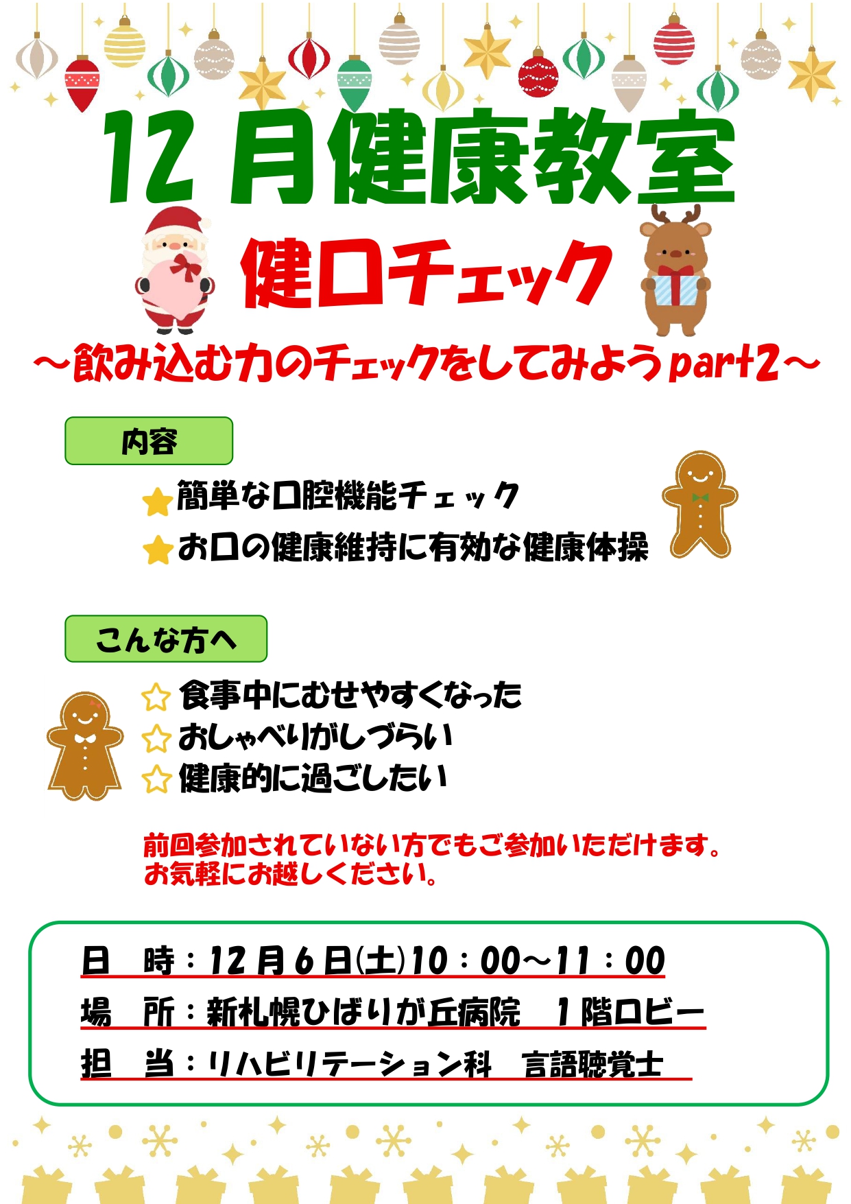 25.12.01 お知らせ 健康教室開催のお知らせ(12月) 12月6日(土)10:00~11:00に1階ロビーにて健康教室を開催します。 今月のテーマは「健口チェック~飲み込む力のチェックをしてみようpart2~」です。 食事中にむせやすくなった、しゃべりづらい・・・など 簡単な口腔チェックとお口健康維持の体操を行います。 前回6月に行った続きにはなりますが、初めての方でもわかりやすい内容にしています。 是非参加お待ちしています!